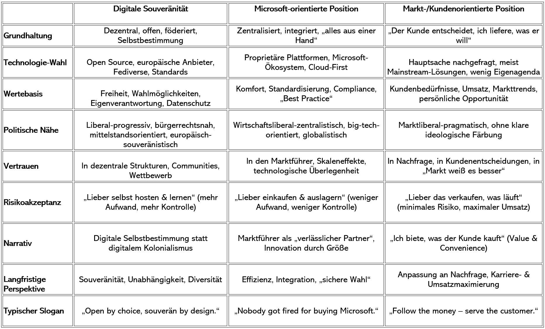 Heute nehme ich eine „rebellischere“ Haltung ein: Ich setze mich bewusst für digitale Souveränität, offene Standards, Wahlfreiheit sowie gegen Monopolstellungen ein. Auch innerhalb eines Umfelds, das überwiegend markt- und kundenorientiert arbeitet. Am Ende haben wir eben nicht nur eine Verantwortung in der IT Kosten zu sparen und die beste Lösung zu platzieren/zu wählen, wie ich bereits hier in meinem Artikel über ethische IT dargelegt habe.