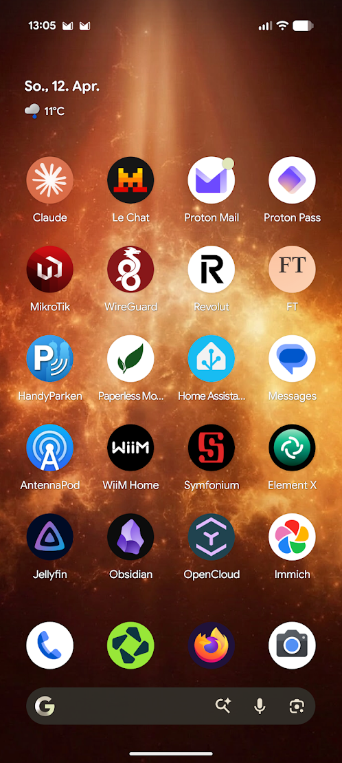 Nun wäre es allerdings zu einfach, den Artikel an dieser Stelle in irgendeine Pose digitaler Reinheit kippen zu lassen. Pandolin, der Paladin der Freiheit. 😄 Mein Homescreen ist kein Manifest völliger Abkopplung. Da sind ganz bewusst auch pragmatische Widersprüche sichtbar. Da ist Firefox und gleichzeitig die Google-Suchleiste. Da sind Revolut und die Financial Times.
