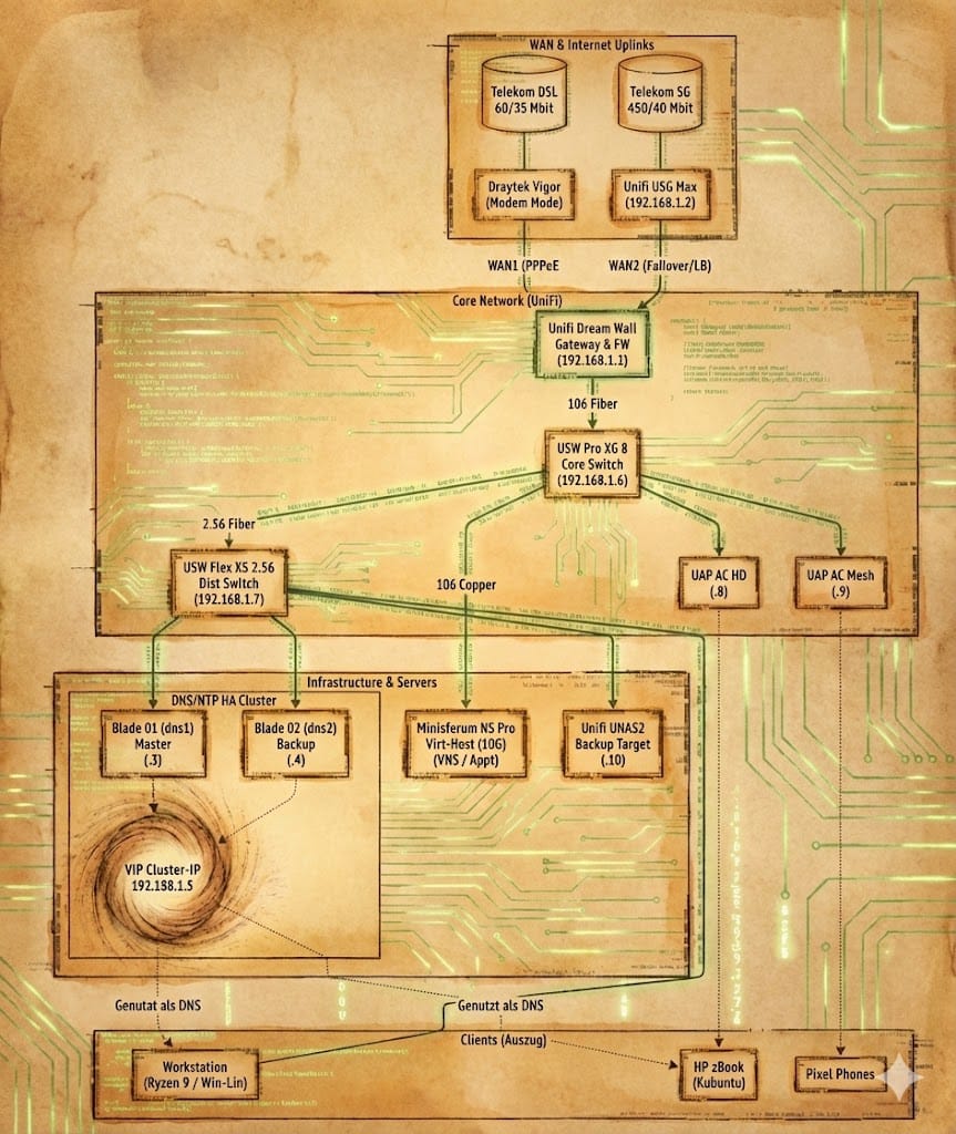Die lebende Dokumentation meiner souveränen Linux-Infrastruktur. Ein Deep-Dive in Hardware, Netzwerk-Topologie, High-Availability DNS/NTP Cluster und die Philosophie dahinter.