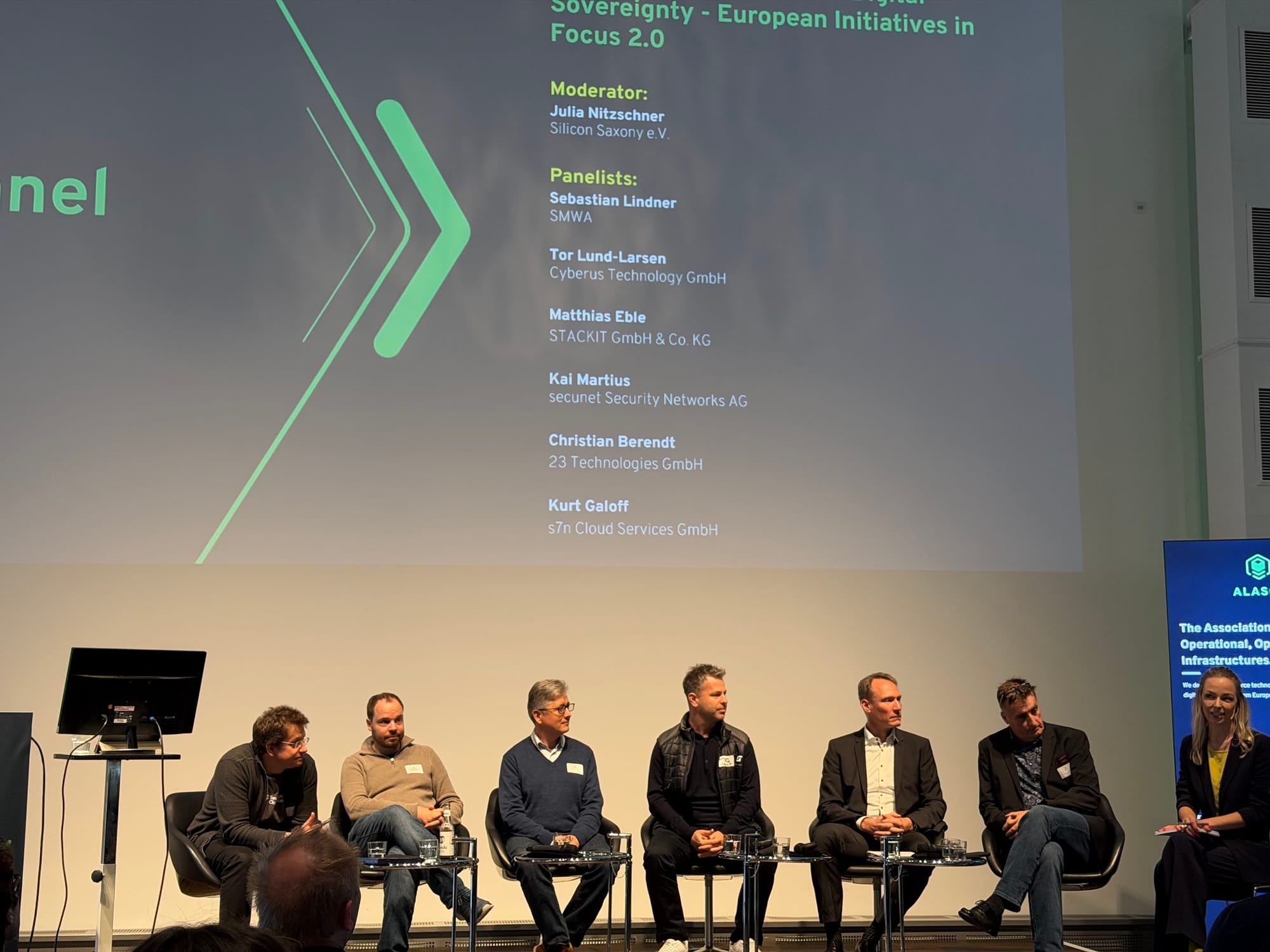 Dr. Sebastian Lindner, Referatsleiter für Grundsatzfragen Digitalisierung und KI aus Sachsen, Tor Lund-Larsen (Cyberus Technology GmbH), Stephan Ilaender (STACKIT), Kai Martius (secunet), Christian Berendt (23Technologies) und Kurt Garloff (Sovereign Cloud Stack / s7n Cloud).