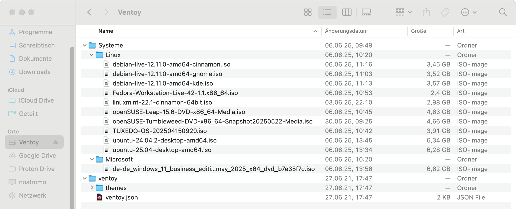 Hier kam die Wende. Wer Distributionen testen will, braucht ein gutes Boot-Management. Ich erinnerte mich an frühere mechanische Festplatten mit ISO-Switch-Funktion und nettem Display. Ein Google-Dialog mit Gemini Pro spHier kam die Wende. Wer Distributionen testen will, braucht ein gutes Boot-Management. Ich erinnerte mich an frühere mechanische Festplatten mit ISO-Switch-Funktion und nettem Display. Ein Google-Dialog mit Gemini Pro später stieß ich auf Ventoy – ein kleines Open Source-Wunder.