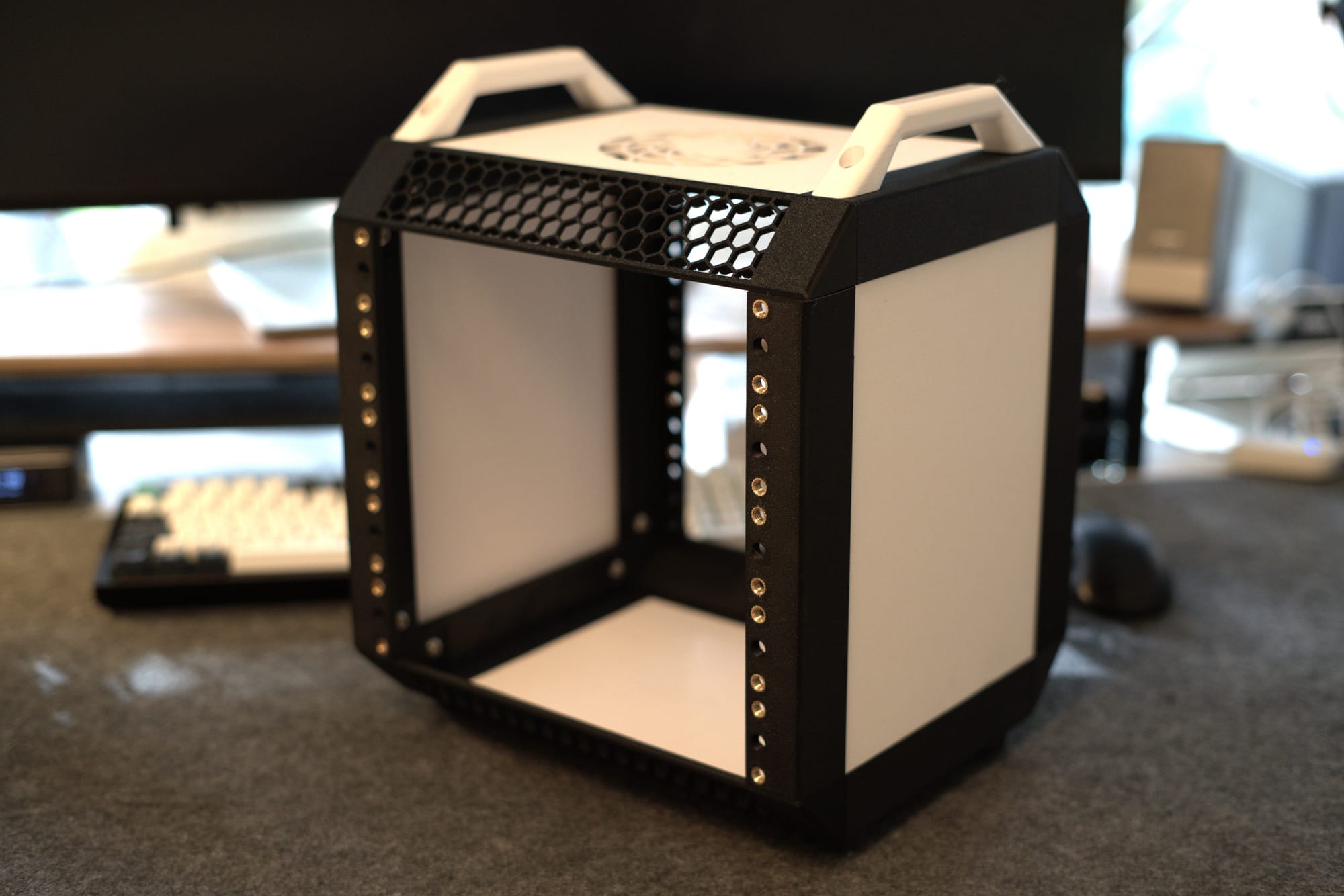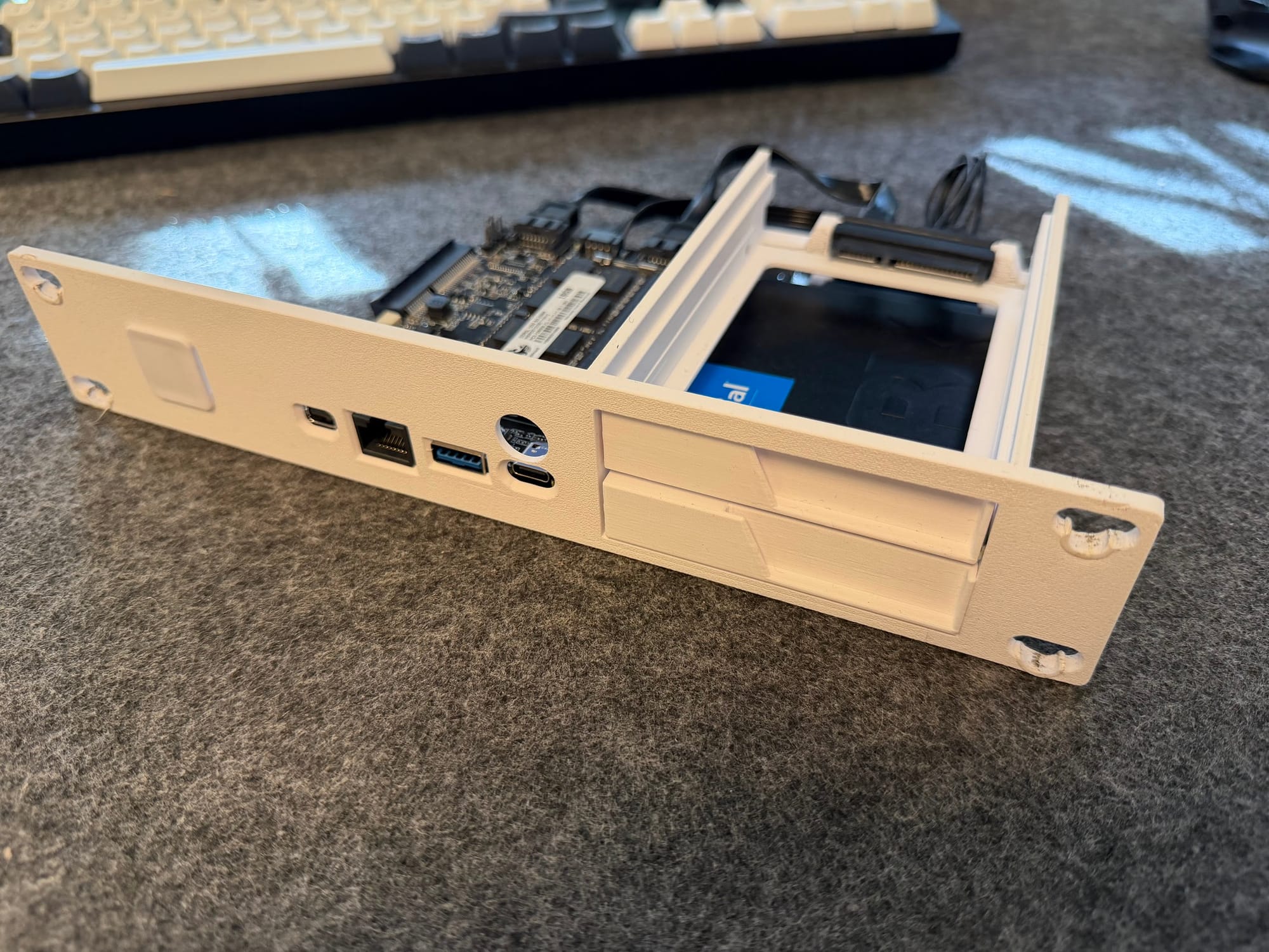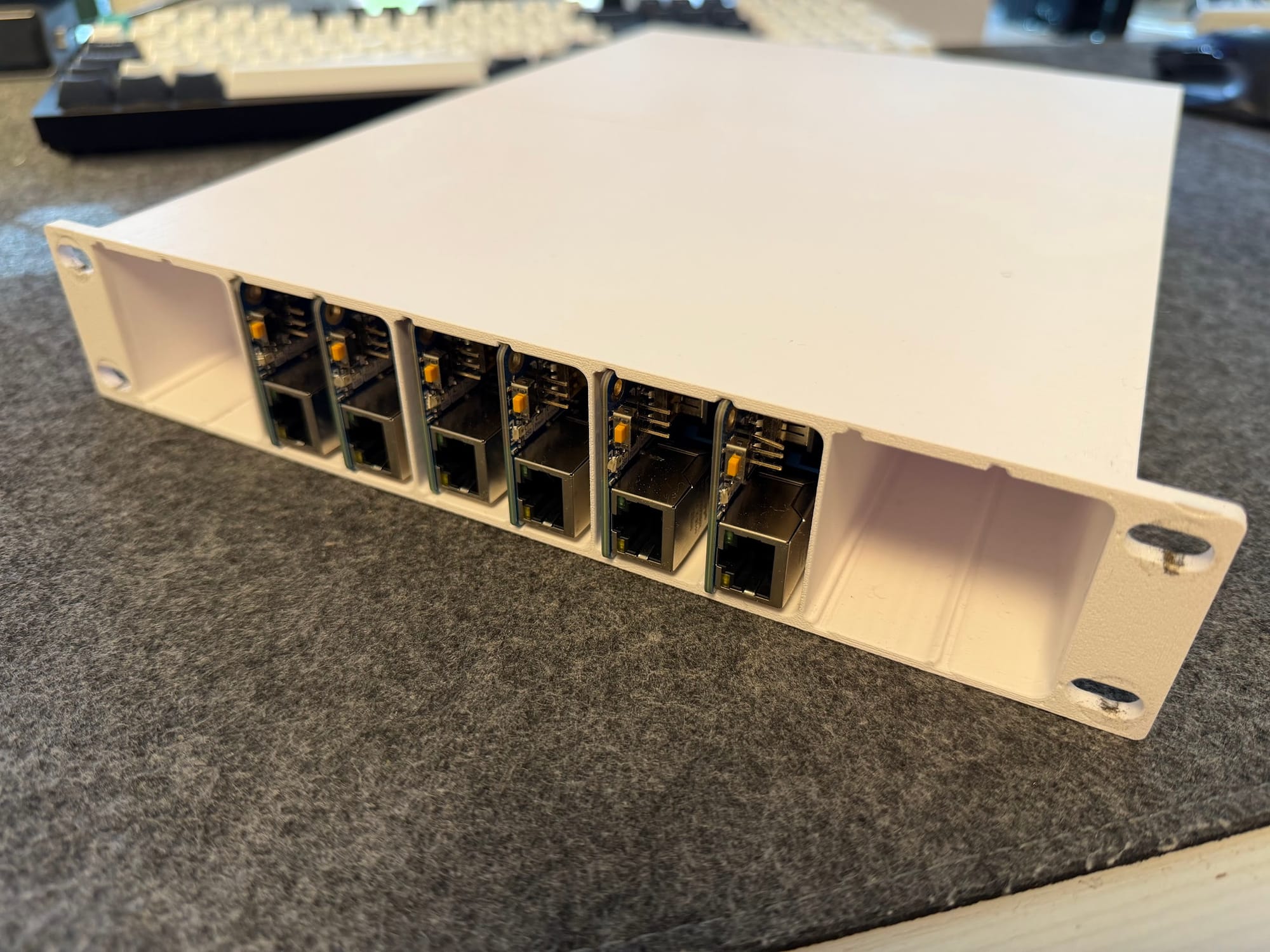 Ich muss in meinem recht kleinen Arbeitszimmer klarkommen. Ein 19“-Rack wäre zu groß gewesen. Der W.A.F. (Women Acceptance Factor) wäre damit auch nur schlecht gegeben, ich habs probiert. 10“-Racks findet man nur in der Nische, ausserdem macht "Selberbauen" also: 3D-Drucker anwerfen.