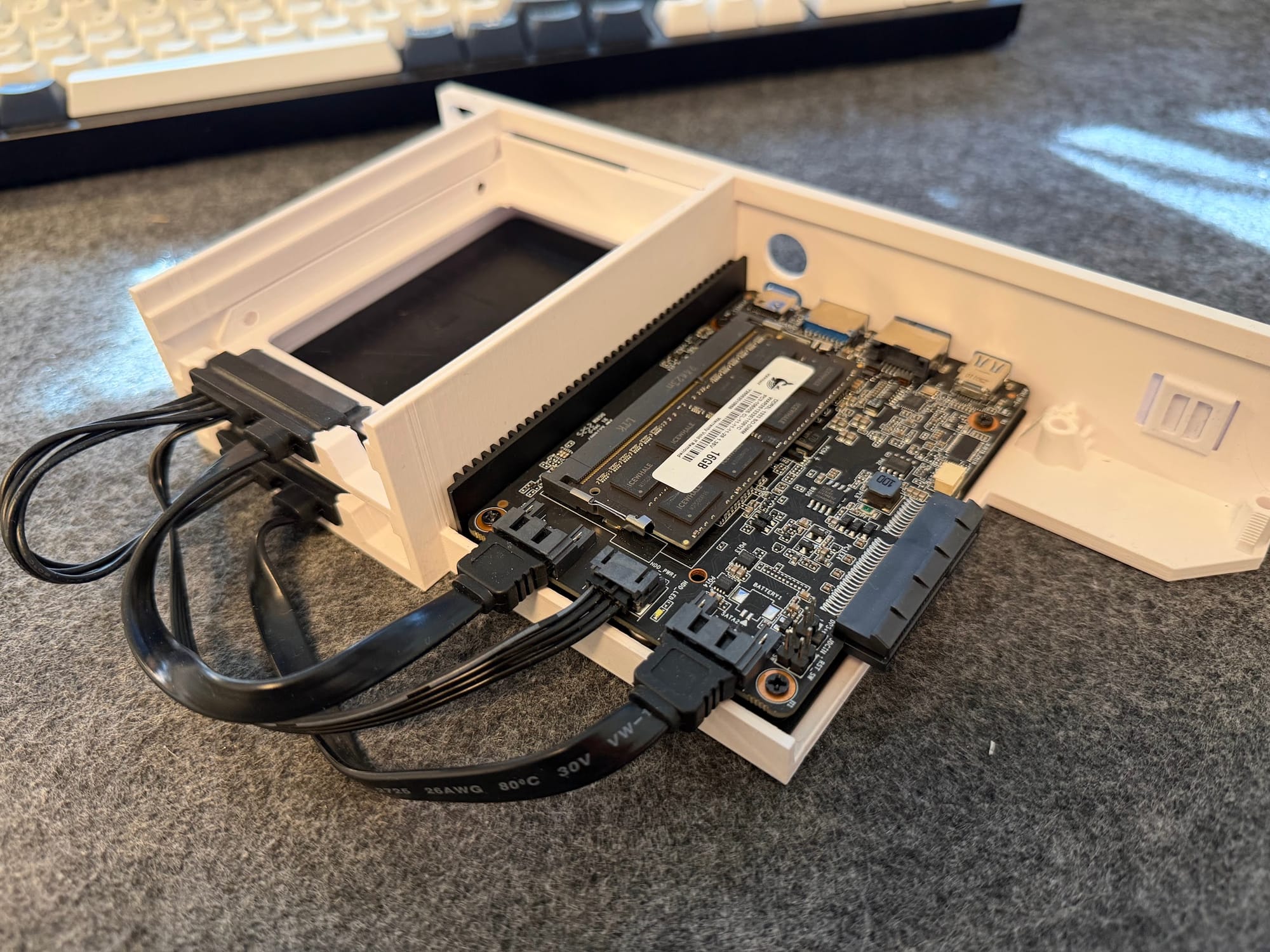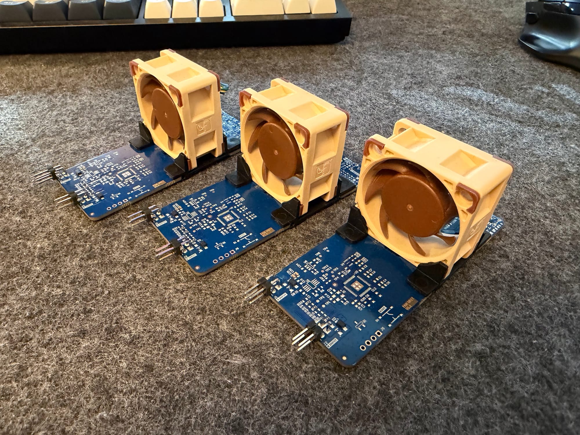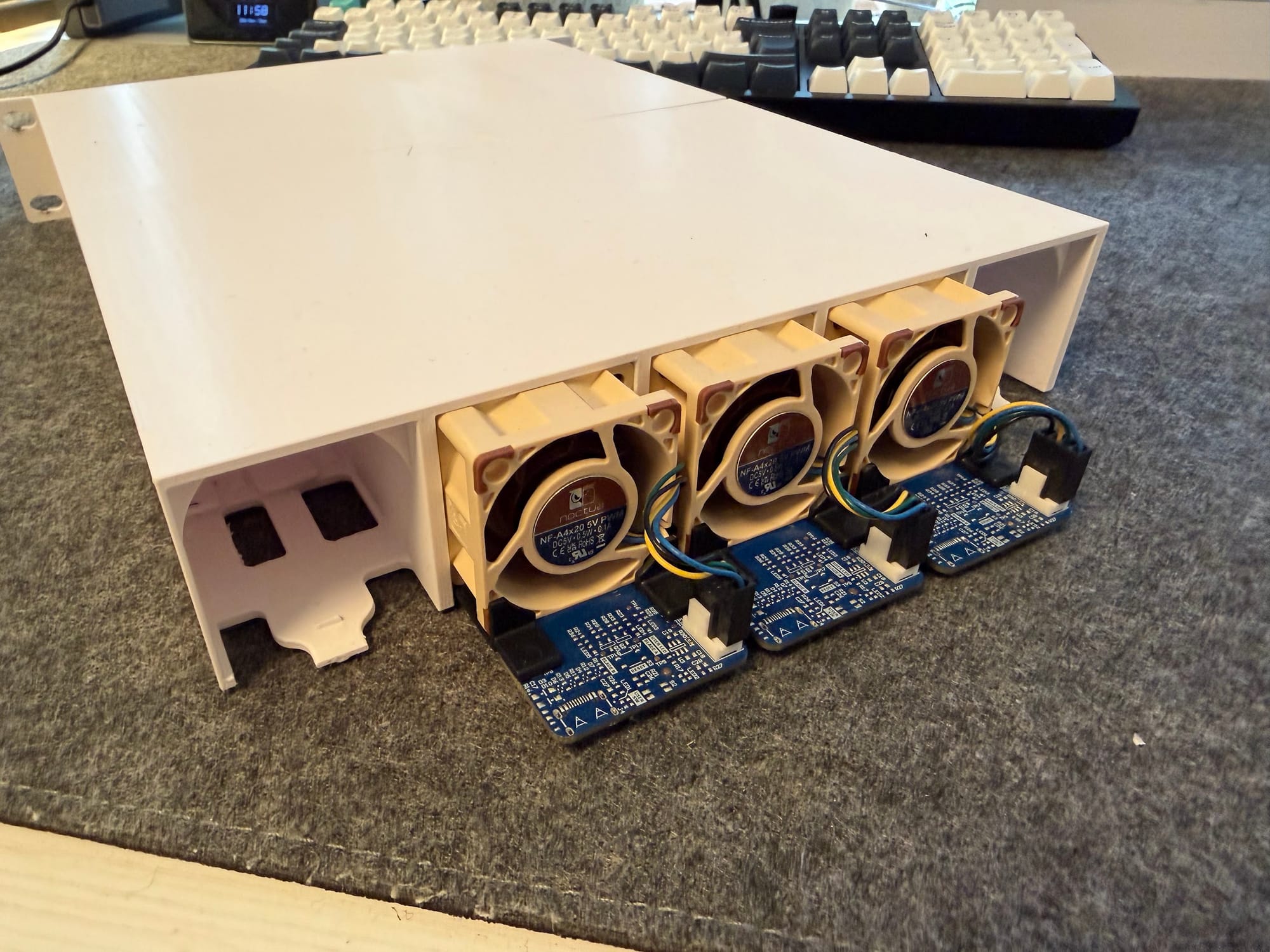 Sie sitzen in individuell gedruckten Schlitten, jeweils zwei Blades teilen sich eine Lüftungseinheit, sodass aktiver Airflow durchs Rack entsteht. Ohne diesen Airflow würden die CM5 unter Last nach exakt zwei Minuten in die Knie gehen. Ich habe es ausprobiert. Es war nicht schön.
