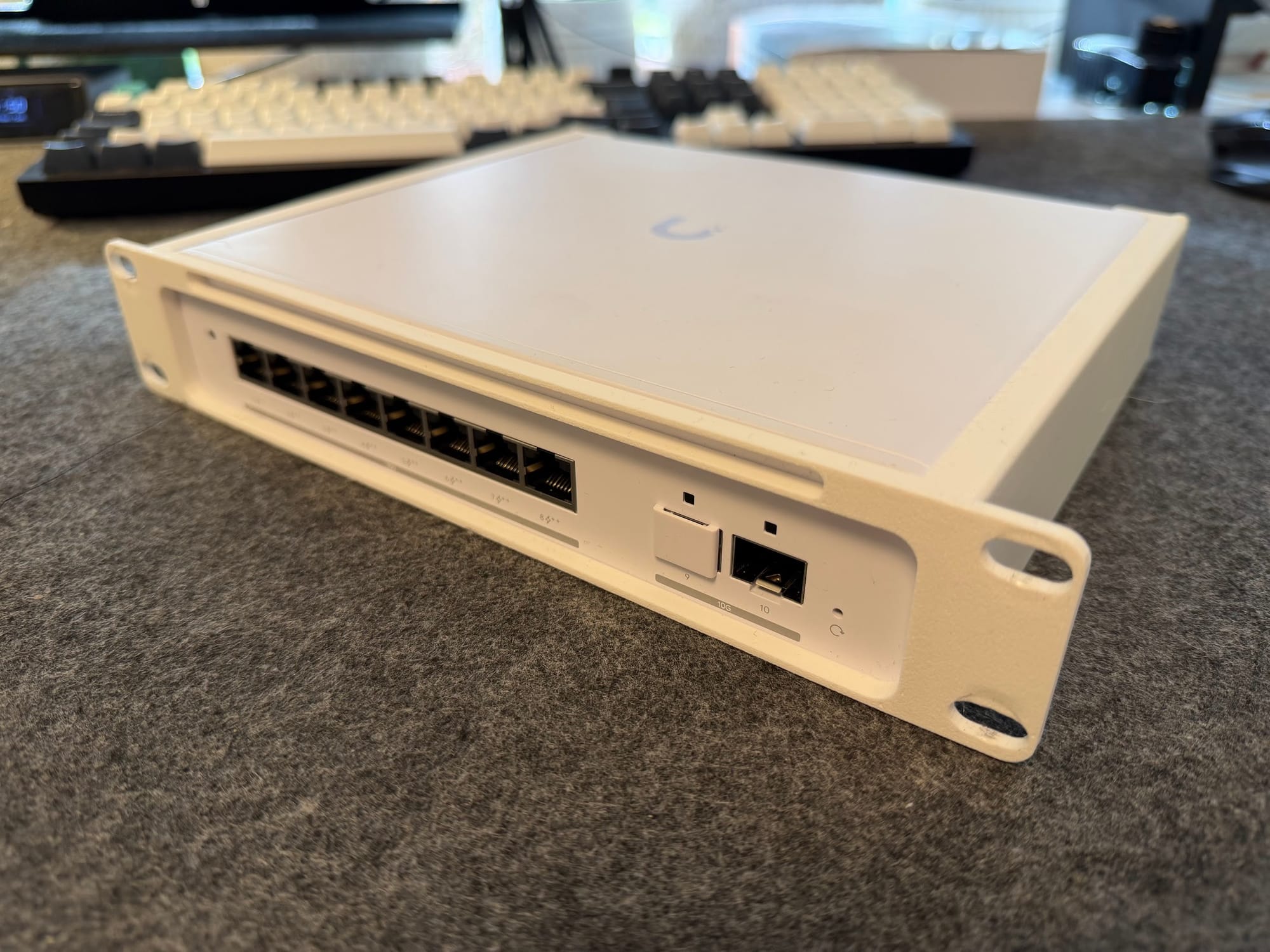 Ganz unten im Rack sitzt ein Ubiquiti-Switch, ein UniFi Pro XG 8 PoE, der zwei Aufgaben hat:
