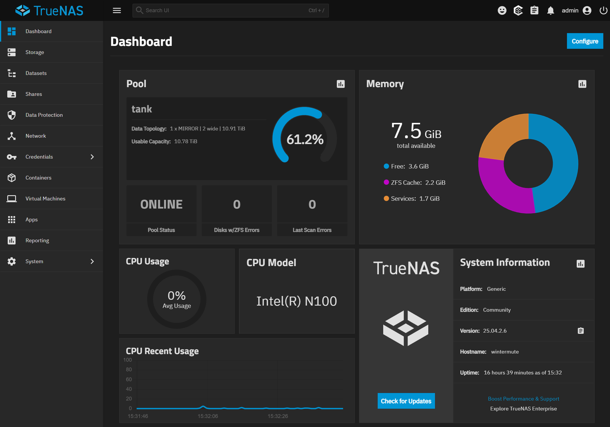 Nicht die aktuelle Version, sondern TrueNAS 24.04 Dragonfish. Zwei Generationen älter. Die installiert sich völlig problemlos auf der eMMC, als wäre nie etwas gewesen. Von dort aus dann ganz entspannt das In-place-Upgrade auf TrueNAS 24.10 Electric Eel und anschließend auf TrueNAS 25.04 Fangtooth. Mit Zwischenschritt, reine Vorsicht. Ich hatte für diese Woche genug Überraschungen.