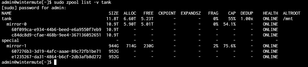 lsblk – alle Platten da. Also bauen wir das halt per Hand. Zwei HDDs als Spiegel: sudo zpool create -f tank mirror /dev/sda /dev/sdb