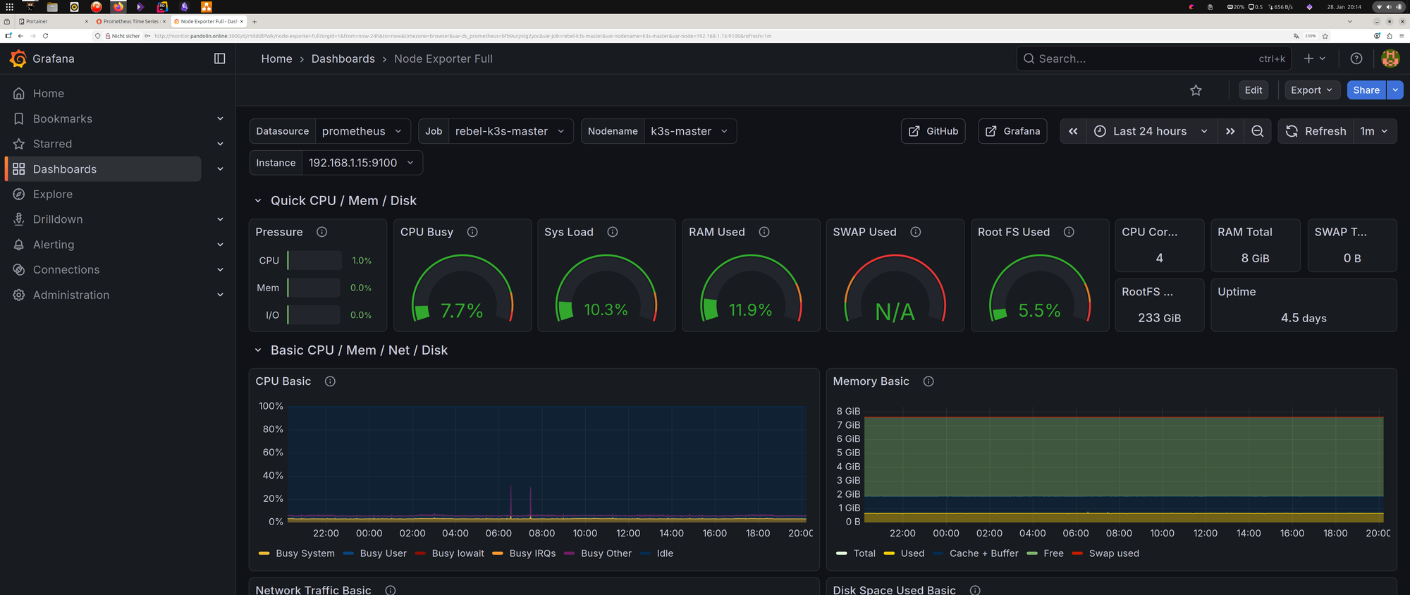 - Der Stack: Prometheus als Daten-Sammler und Grafana für eine attraktive Visualisierung. Das sind keine experimentellen Tools sondern ausgereifte Projekte, die in extrem vielen großen professionellen Infrastrukturen eingesetzt werden