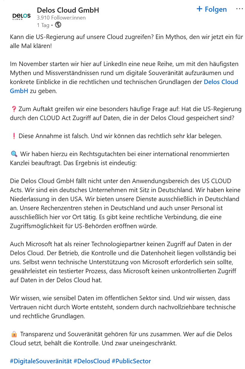 Gerade jetzt im November 2025 meldete sich Delos selbst zu Wort, um „Mythen um die digitale Souveränität“ zu entkräften. In einem LinkedIn-Statement schreibt das Unternehmen: